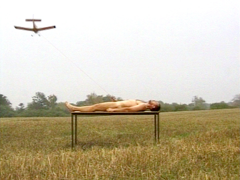 A man is lying on a table placed in a field. Above his head a model glider circulates. The glider is not floating in space freely, but is fastened the male member, and the circle of the glider is followed by an erection which is also circulating. Without any start or end the circulation continuous in an ongoing loop.