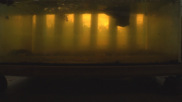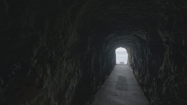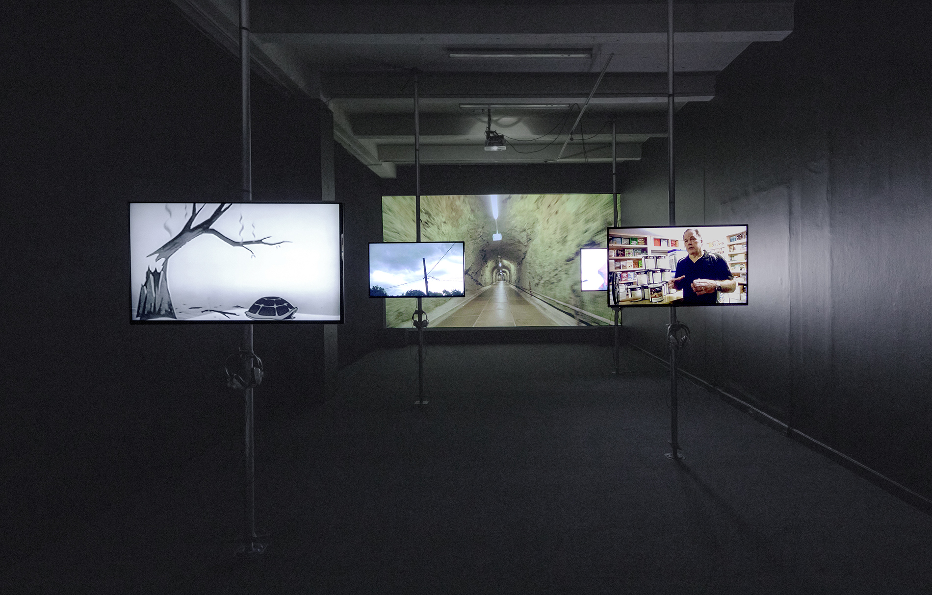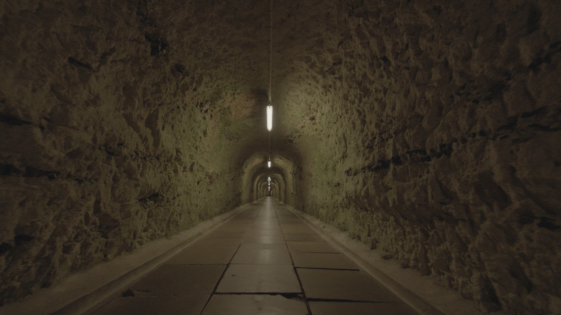 On the third screen in the installation we drive with a meditative camera-flow through long corridors at Stevnsfortet, a fortress from the Cold War period.