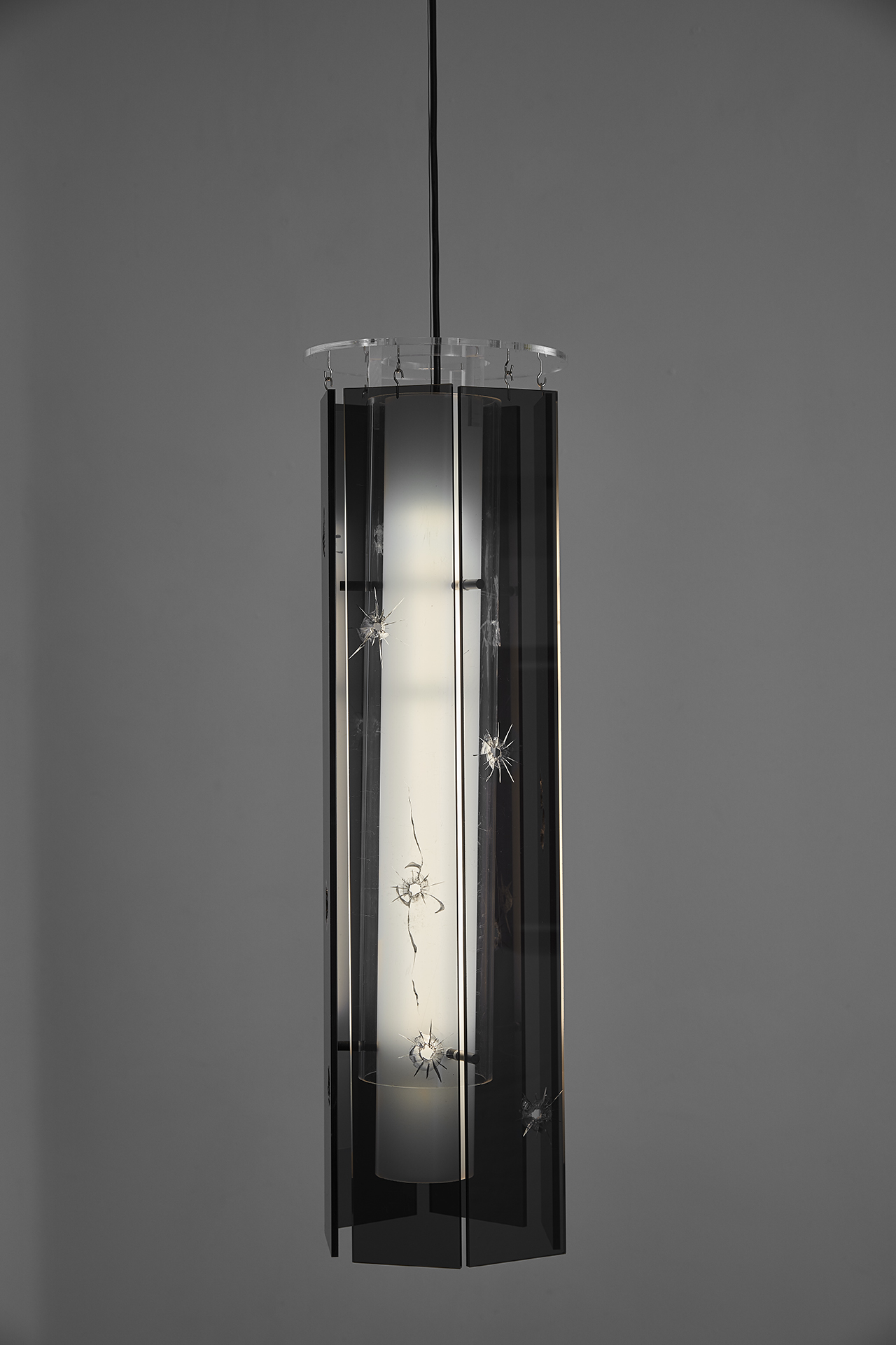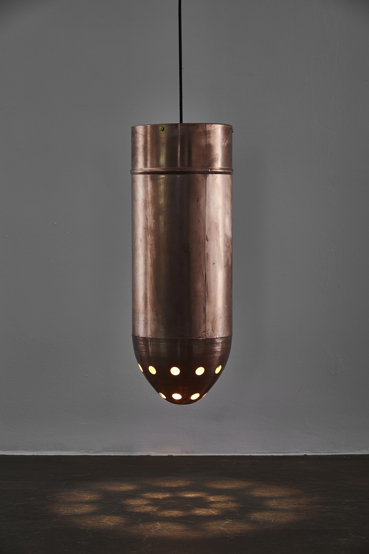 PVC, shot holes, custom made bulb with dimmer, wire.