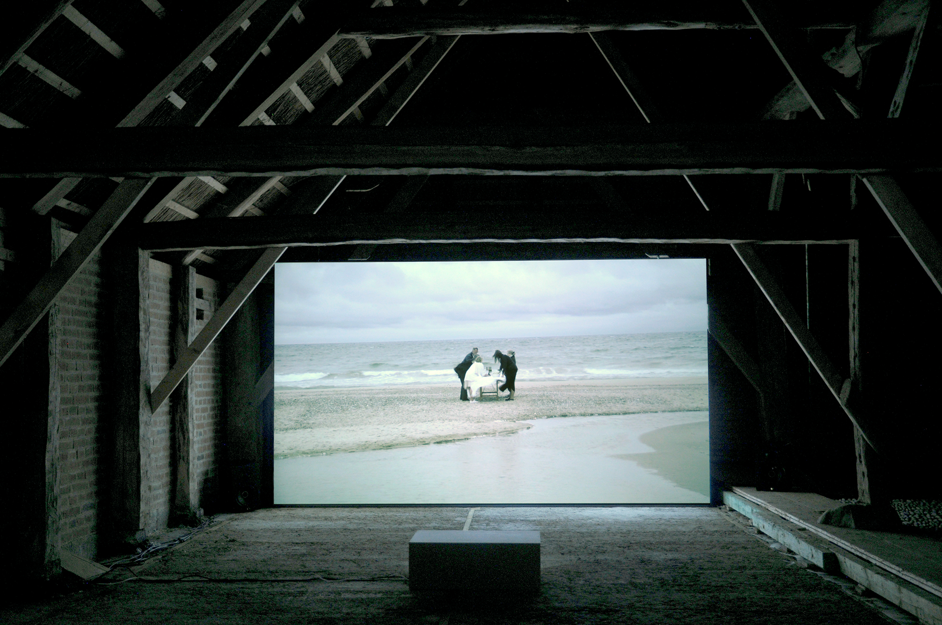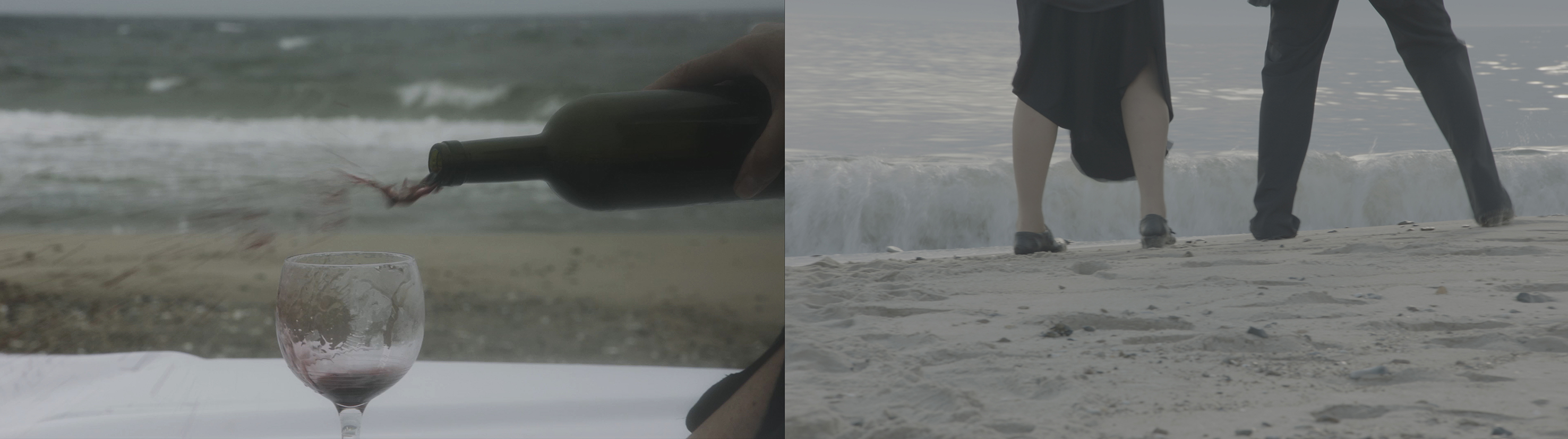 Both are performative-filmed actionsin which a lunch scene and wind blowers both compete with the sea and the wind.
