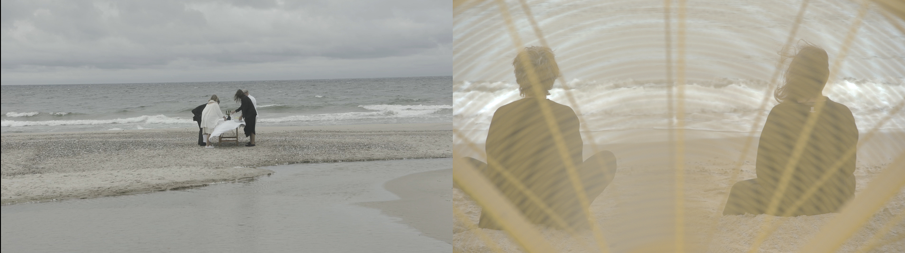 On the second screen, 2 women (the artists) are seen sitting on the beach. Throughout the film the act is right in the surf of the coast. The individual looks towards the horizon line and out towards the world. The statement is open, and can refer to both longing or fear of the unknown, fear of crises and apocalyptic climate predictions.