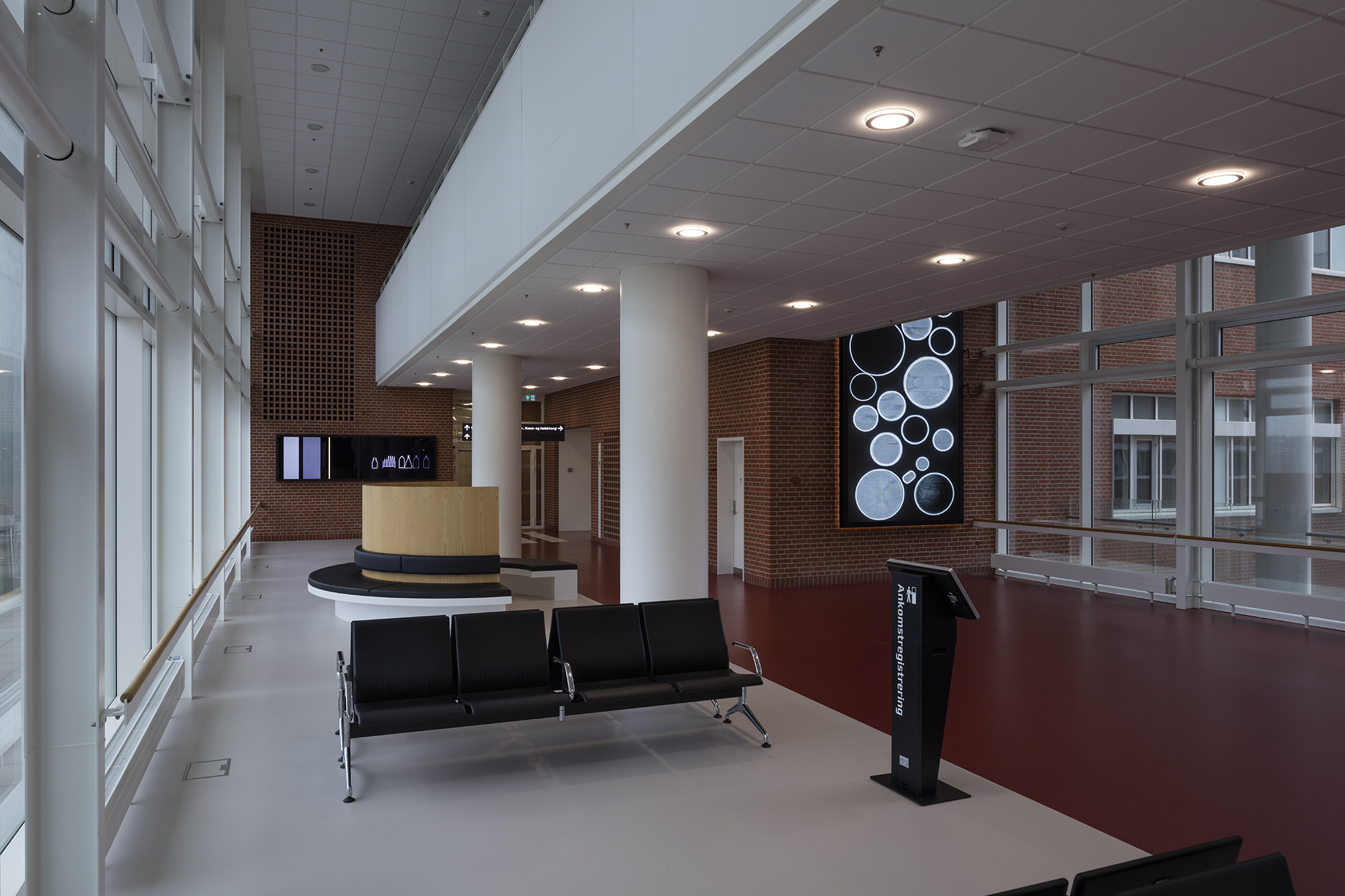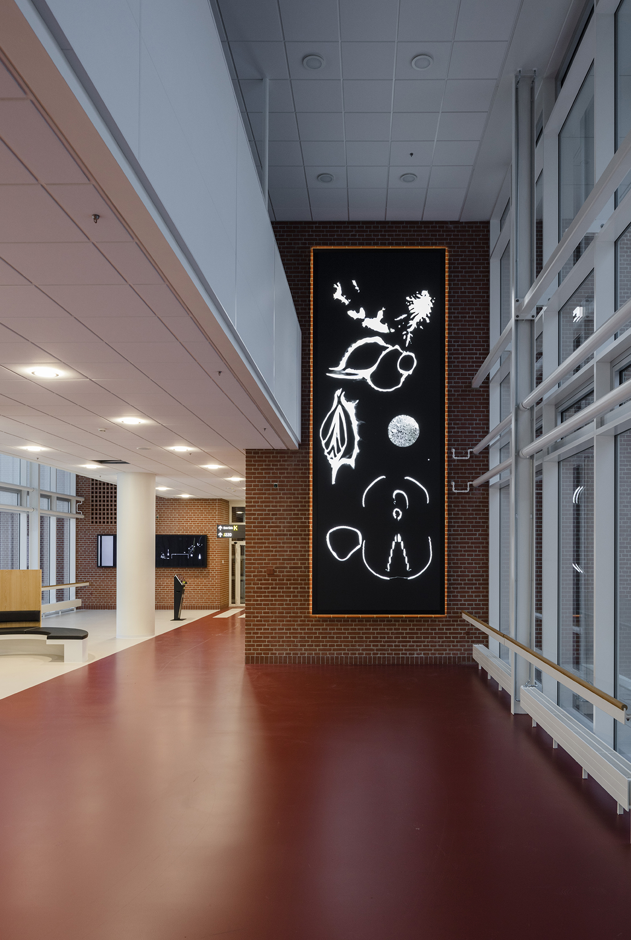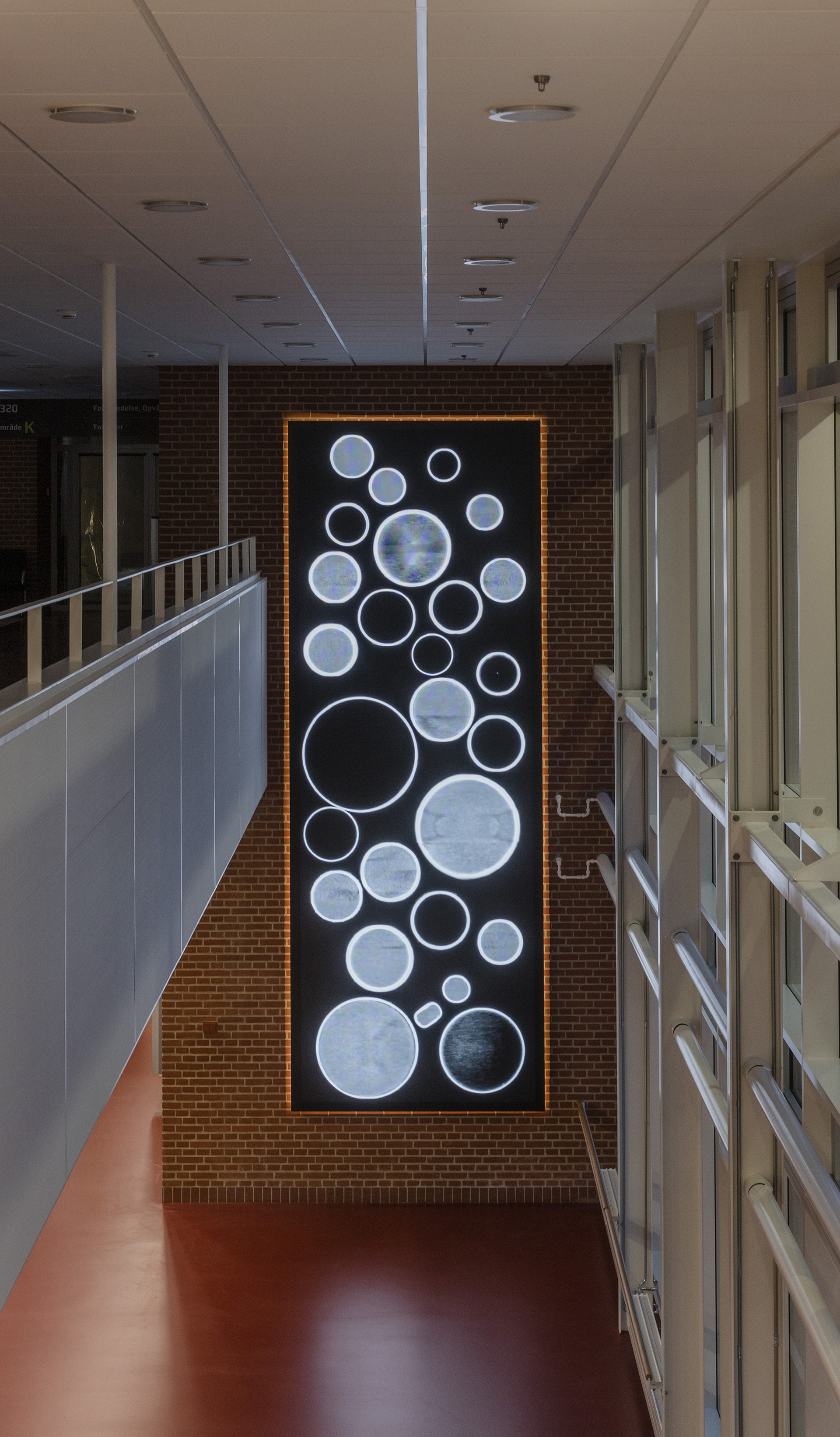the largest being 2x6 meters, and on 4 smaller screens. In addition, the decoration also consists of foil on glass and a number painted stripes on the walls which pass over two floors. The video sequences are generated via CT scans, the hospitals own technique.