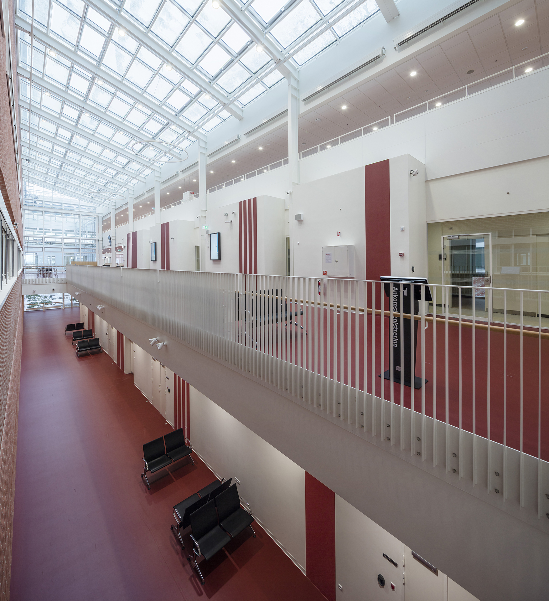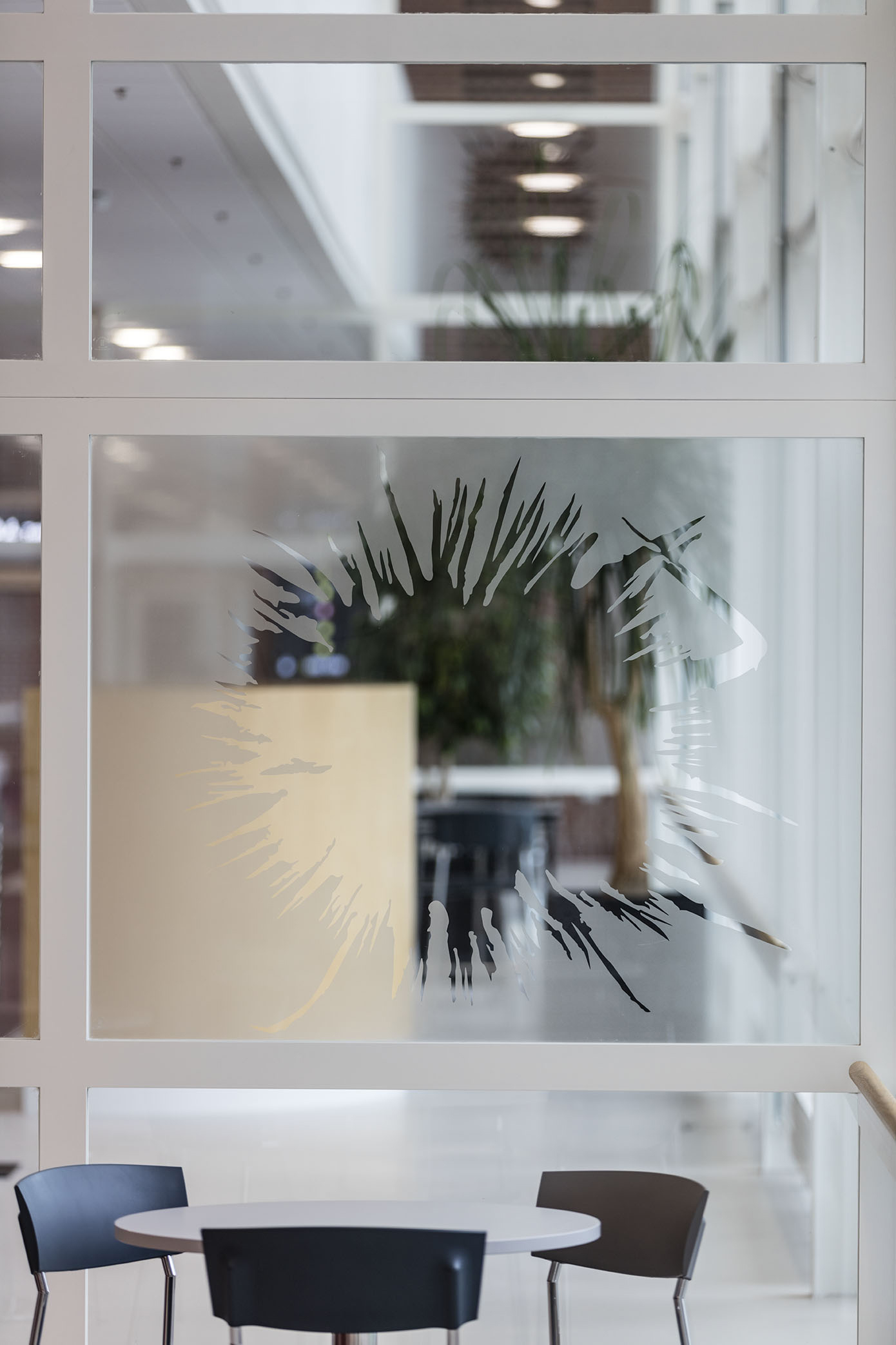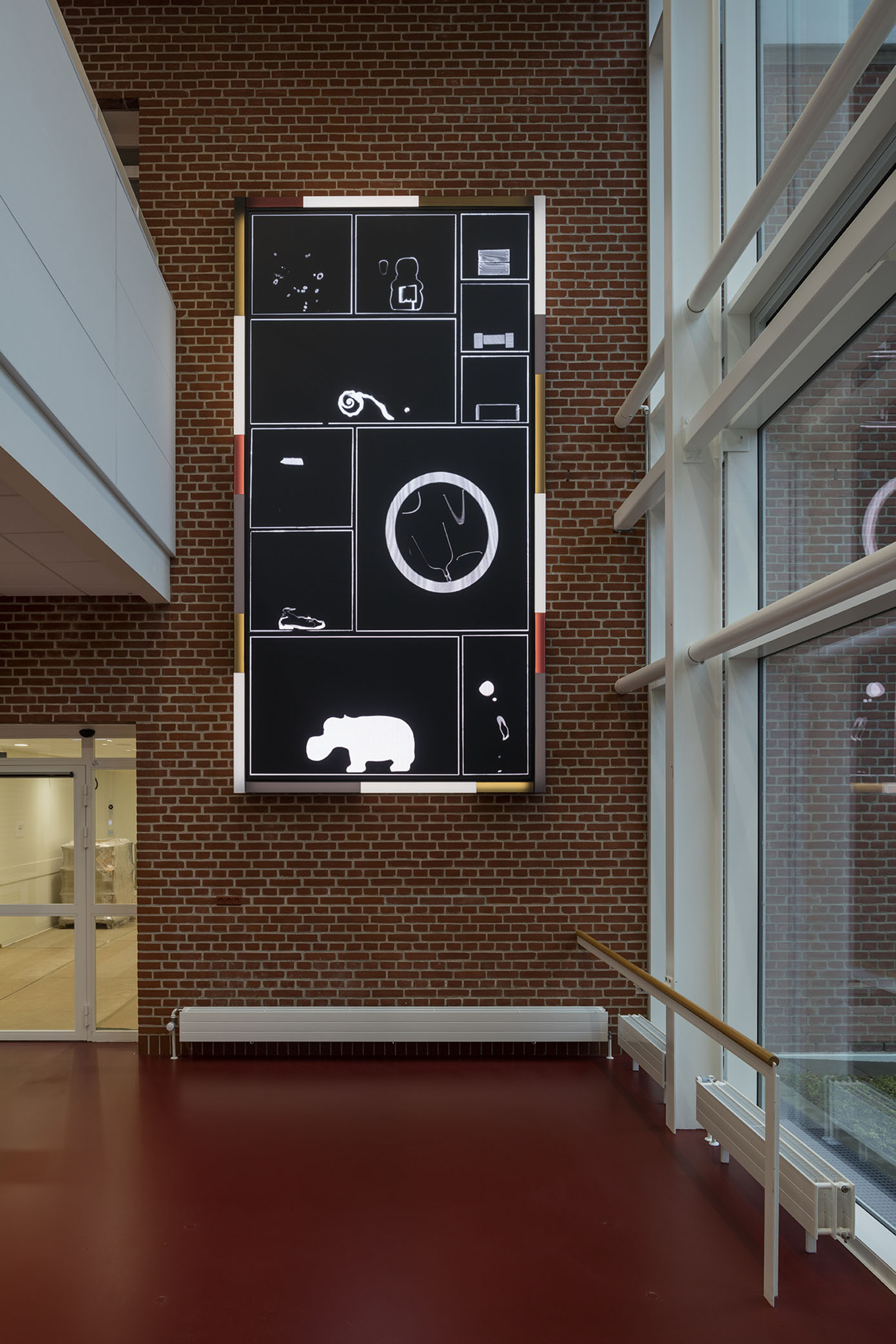 the largest being 2x6 meters, and on 4 smaller screens. In addition, the decoration also consists of foil on glass and a number painted stripes on the walls which pass over two floors. The video sequences are generated via CT scans, the hospitals own technique.