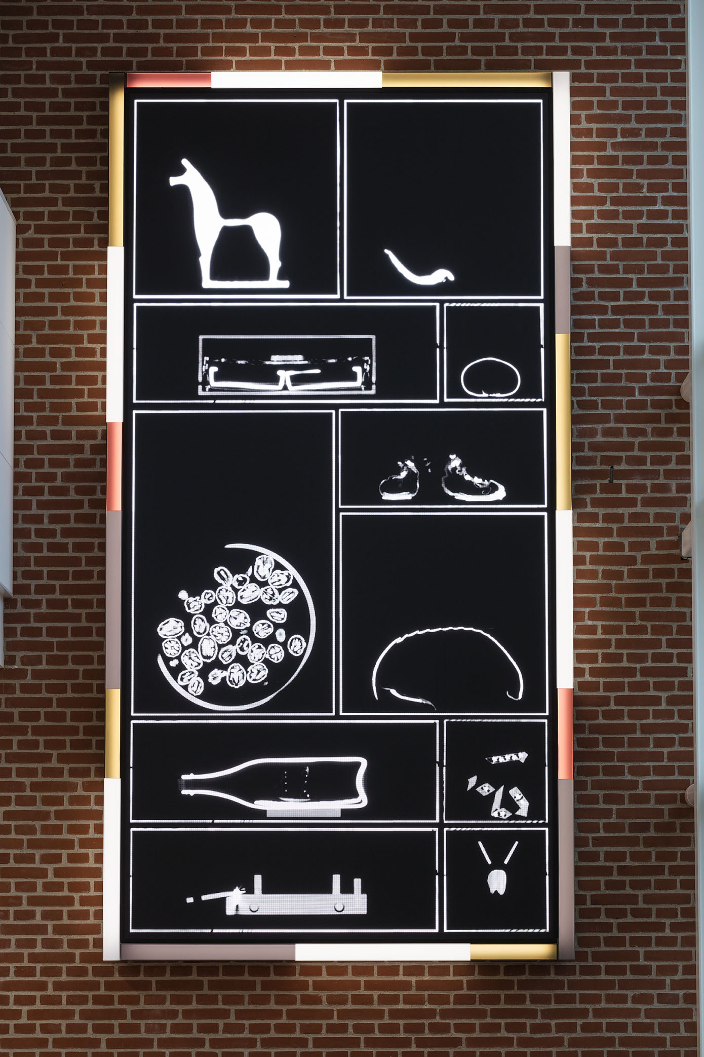 The decoration is inspired of the classic genre of Stilleben and Nature Morte, which, through the assembly and arrangement objects, presents stories of life and death, and science, art and history.The videos cut - like the CT scans - through recognizable objects that slowly appear and disappear again. As a story and a snapshot that changes for each time you pass. The different screens also represent the study angles that doctors themselves use to diagnose.