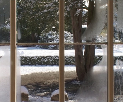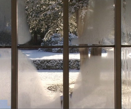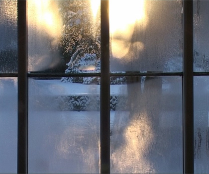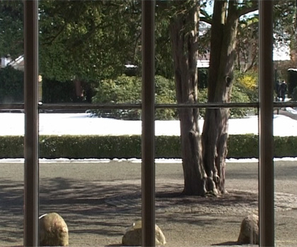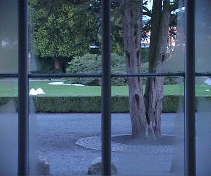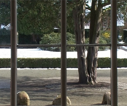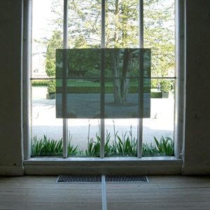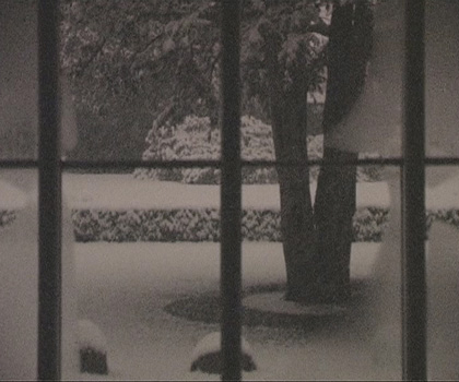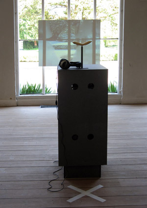 At the exhibition Much could be different….a greeting to Storm P the video ”Position of the Spectator II/ then there was silence, now it remains to be peace” is projected at a screen installed in the window. The video sequense has been filmed one day and night through the same window, where it is projected. The 24 hours are compressed to about 5 minutes. Birds, vans and pedestrians are passing. Night is falling, it starts snowing, the moon appears, and at dawn the snow melts, daily life starts and the video starts looping again. The soundtrack tells its own story. You hear sirens, church bells, shouting and barking, which together leads us to remember past riots in Copenhagen. Three meters in front the projection a socket with a bracket to the chin is standing and on the floor is a cross marked.